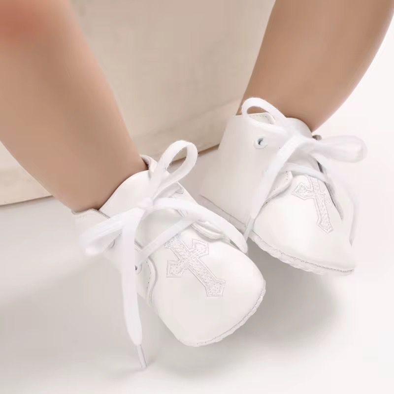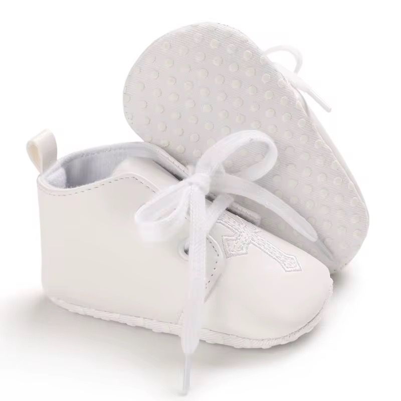 Botoșei albi pentru bebeluși, eleganți și delicați, accesorizați cu broderie fină în formă de cruce. Perfecți pentru botez sau ocazii speciale, oferă confort și un plus de rafinament ținutei.