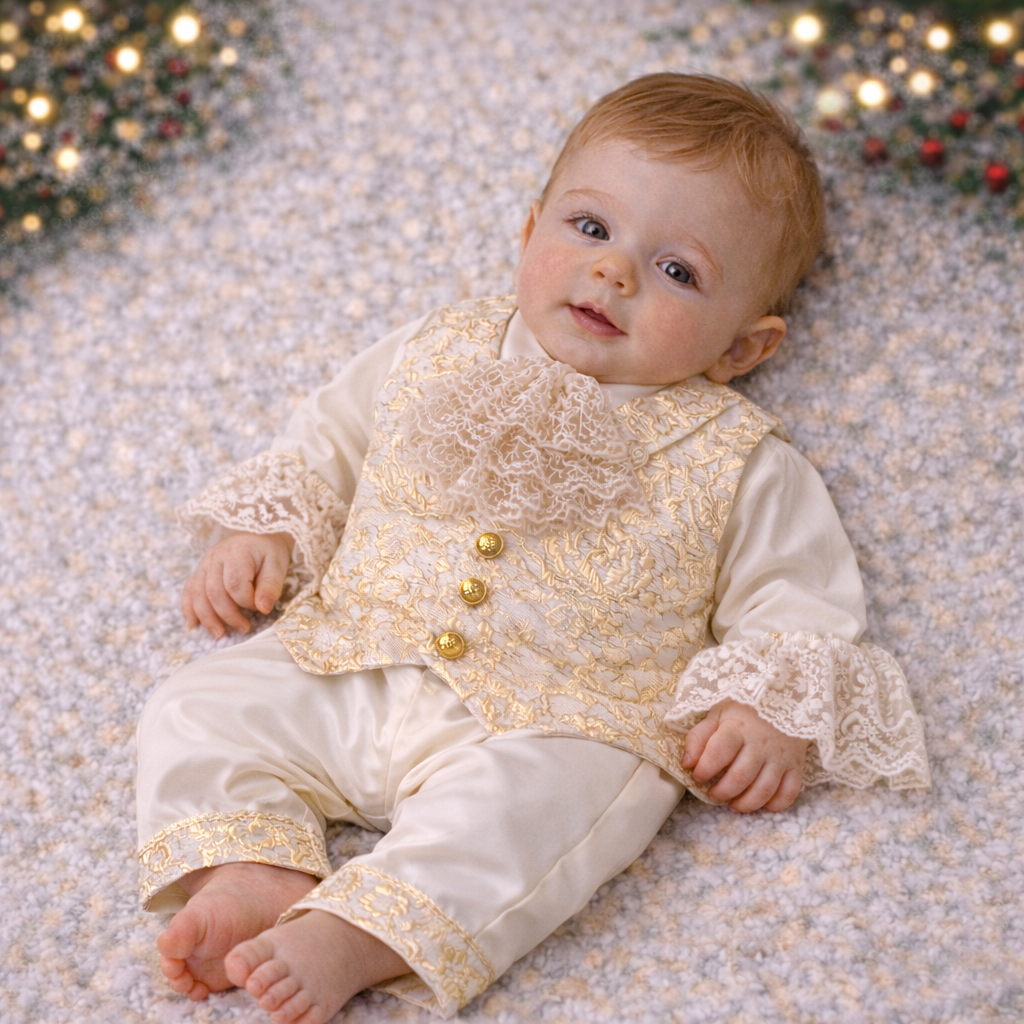 Costum botez băiețel din brocart auriu și bumbac – iarna – Porthos