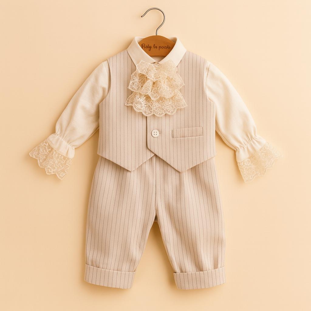 Costum Botez Vara cu vesta Bogo – Realizat din stofa premium, cu dungulite; un costum lejer, de vara, comod, dar elegant, ce se prezinta ca set intreg impreuna cu camasa alba, din bumbac fin, ce nu irita pielea micutului. Este accesorizata cu jabou la gulerul de tip tunica si dantela la incheietura mainii ce confera o eleganta aparte micutului domnisor.