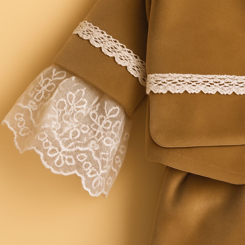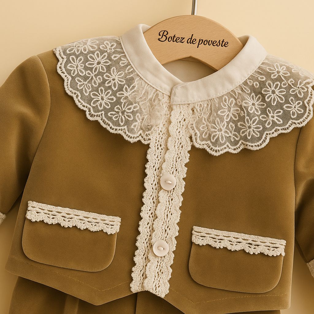 Costum din catifea maro cu dantela de bumbac pentru baiat – Model Capuccino