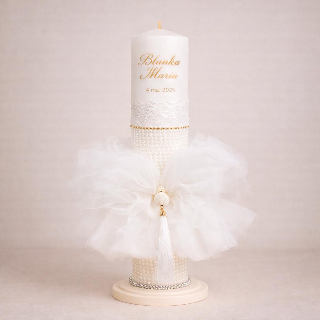 Design & personalizare | Lumânare de Botez eleganta cu dantelă si perle – Model Blanka