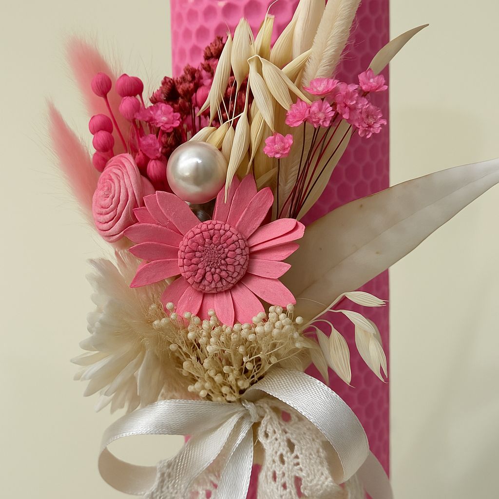 Design & estetică – Lumânare de Botez, ceara naturală roz și aranjament floral – Model Rozeta