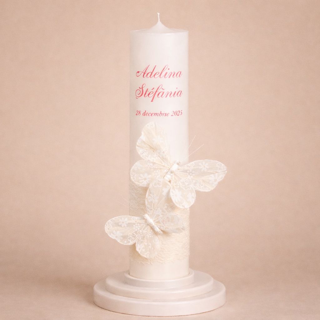 Modelul Chloe Grace este personalizat cu numele copilului și data evenimentului, personalizarea fiind realizată direct pe lumânare. Fluturii, simbol al transformării și al începuturilor curate, sunt așezați armonios peste dantelă, creând un efect vizual delicat și luminos.