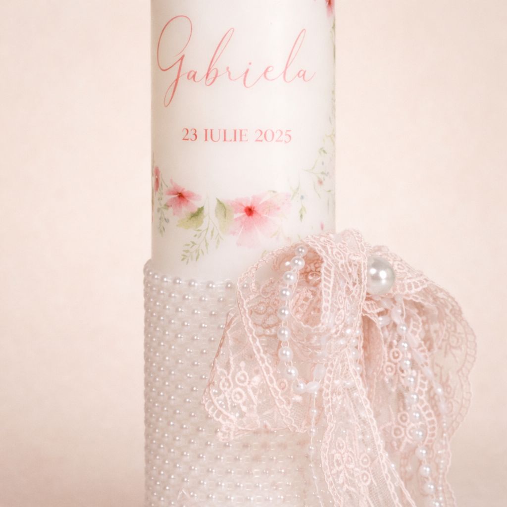 Partea inferioară a lumânării este îmbrăcată în perluțe fine, iar decorul este completat de o fundiță curgătoare realizată dintr-un mix elegant de dantelă și perle, atent aranjată pentru un efect vizual fluid și sofisticat. Personalizarea se realizează prin serigrafie, cu un print floral delicat, prenumele copilului și data evenimentului, transformând lumânarea într-o amintire prețioasă.