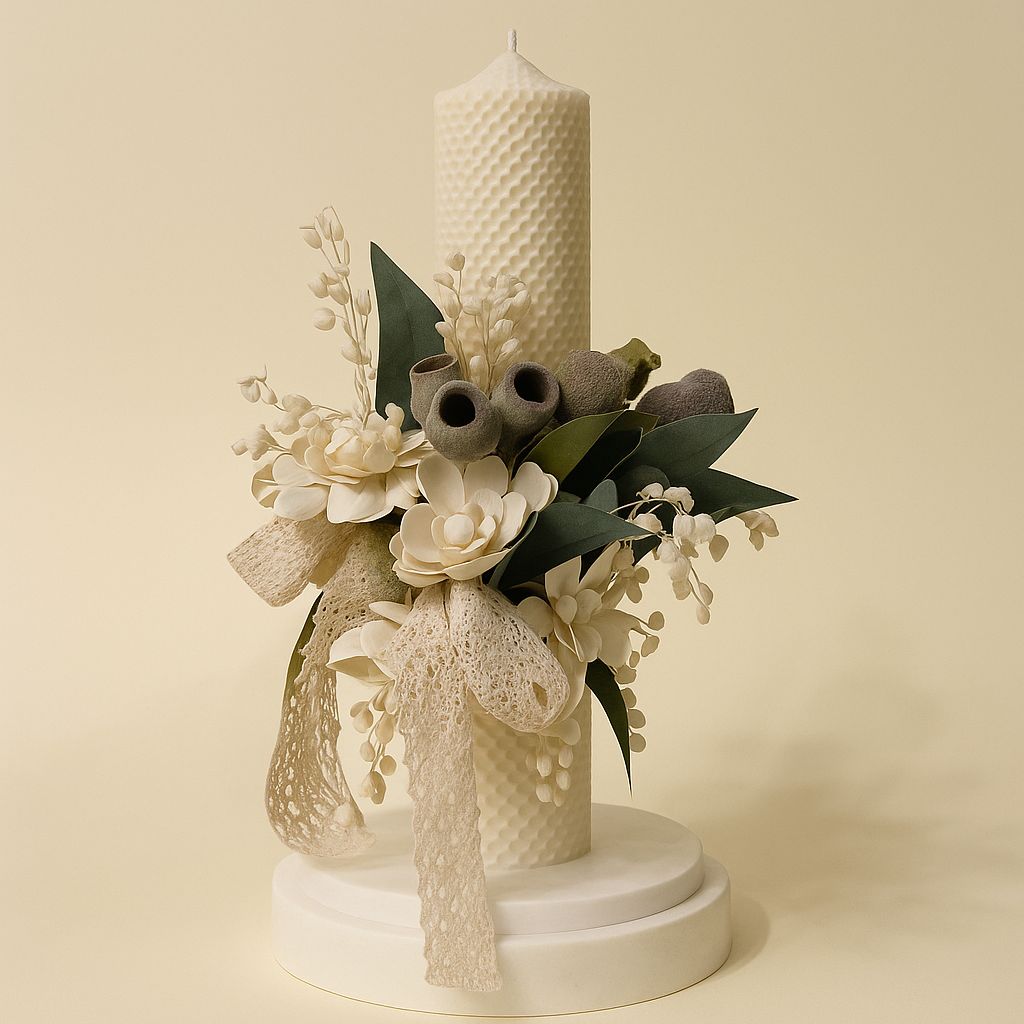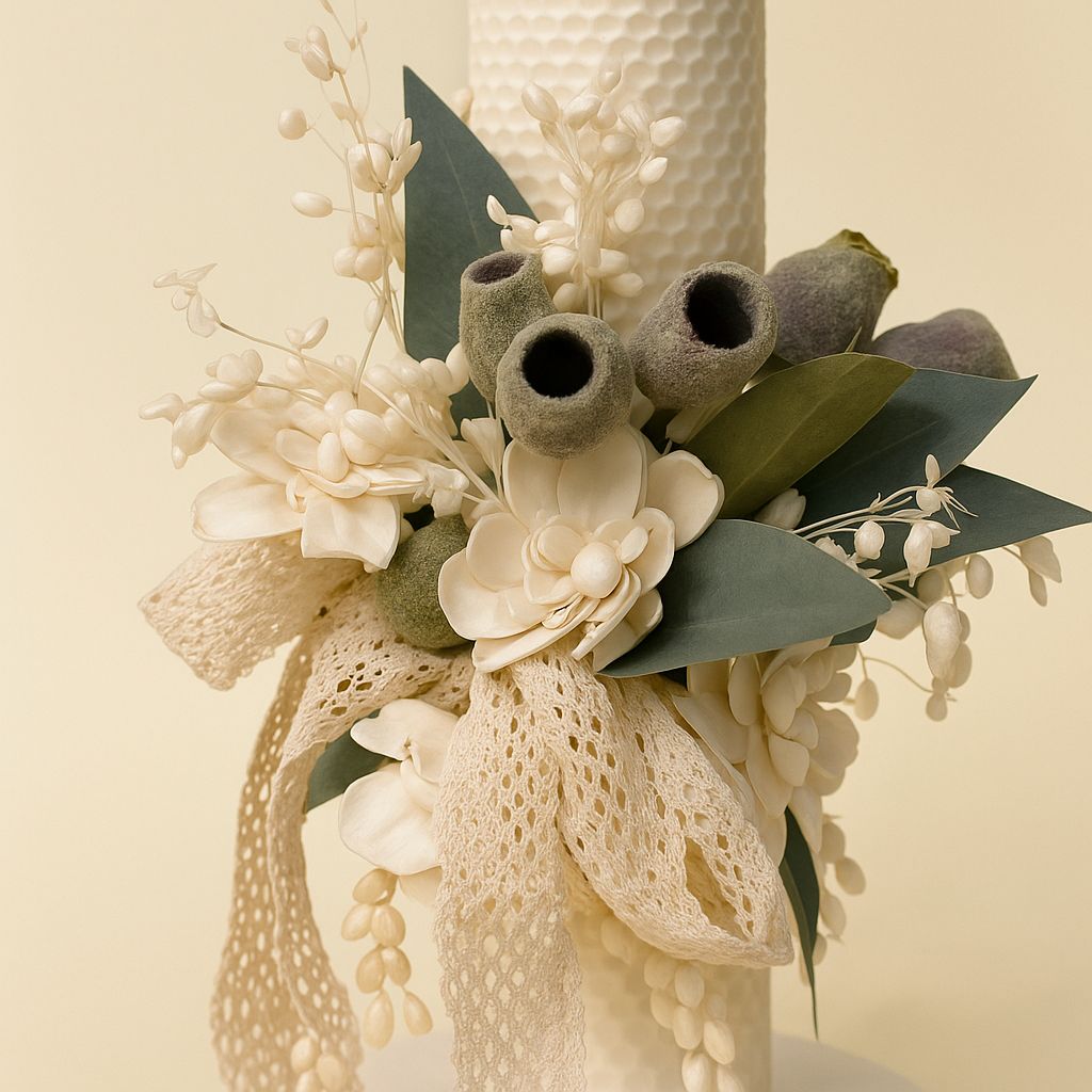 Design & estetică – Lumanare de Botez din ceară naturală, flori uscate si flori de lemn – Model Eden