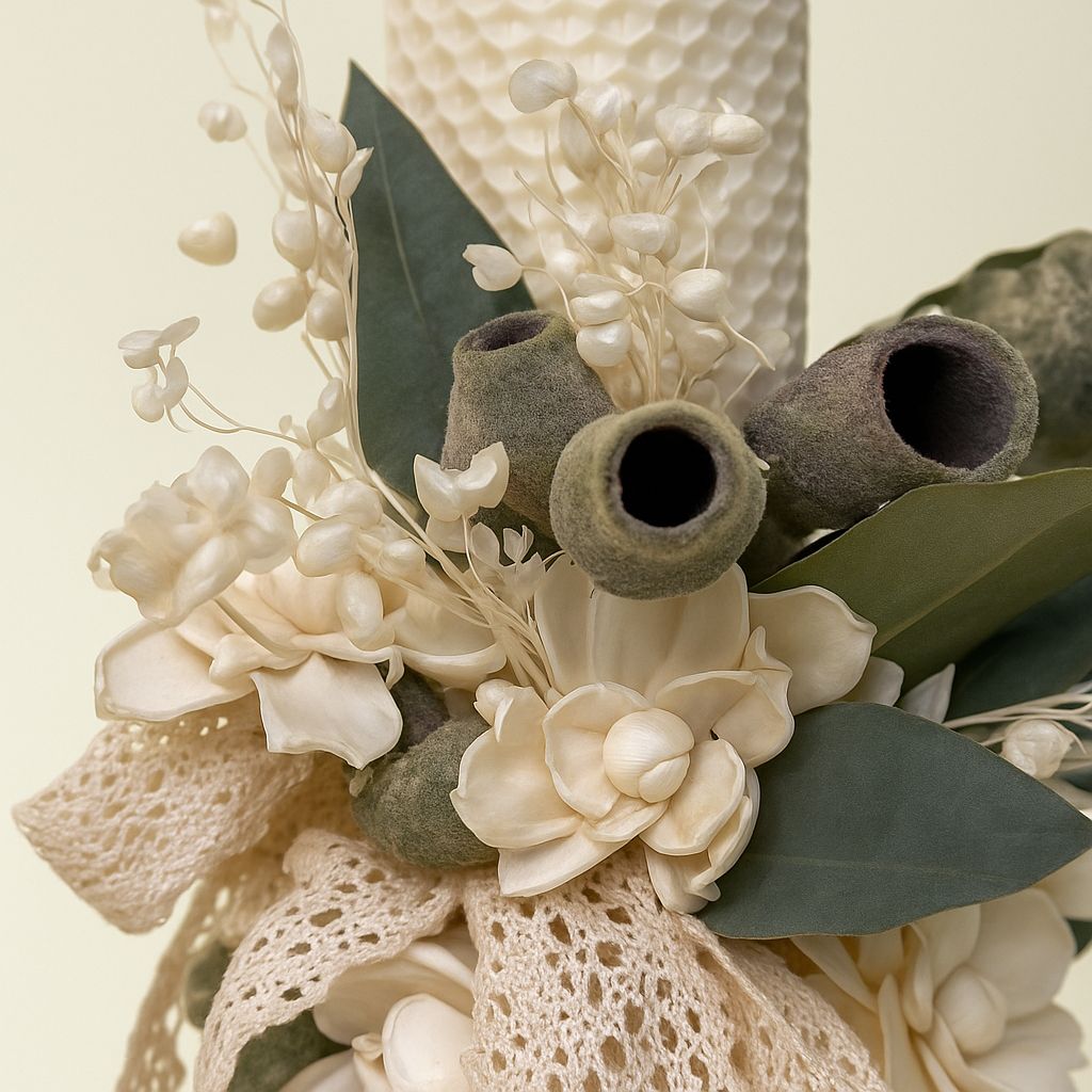 Designul lumânării este construit în jurul nuanțelor naturale: alb cald, crem și verde, fără contraste puternice. Florile uscate și florile de lemn oferă volum și textură, iar elementele vegetale creează un efect vizual aerisit și elegant. Detaliile textile adaugă o notă subtilă de rafinament, fără a încărca compoziția.
