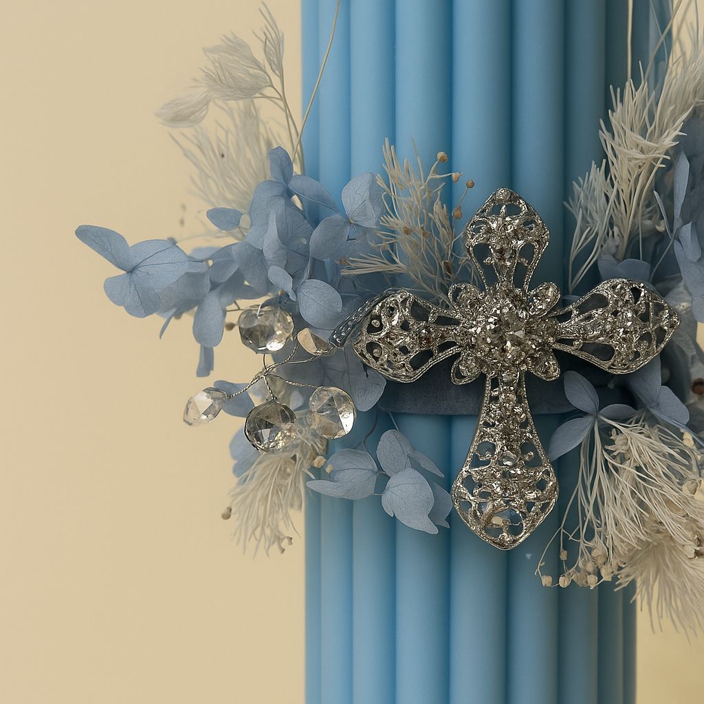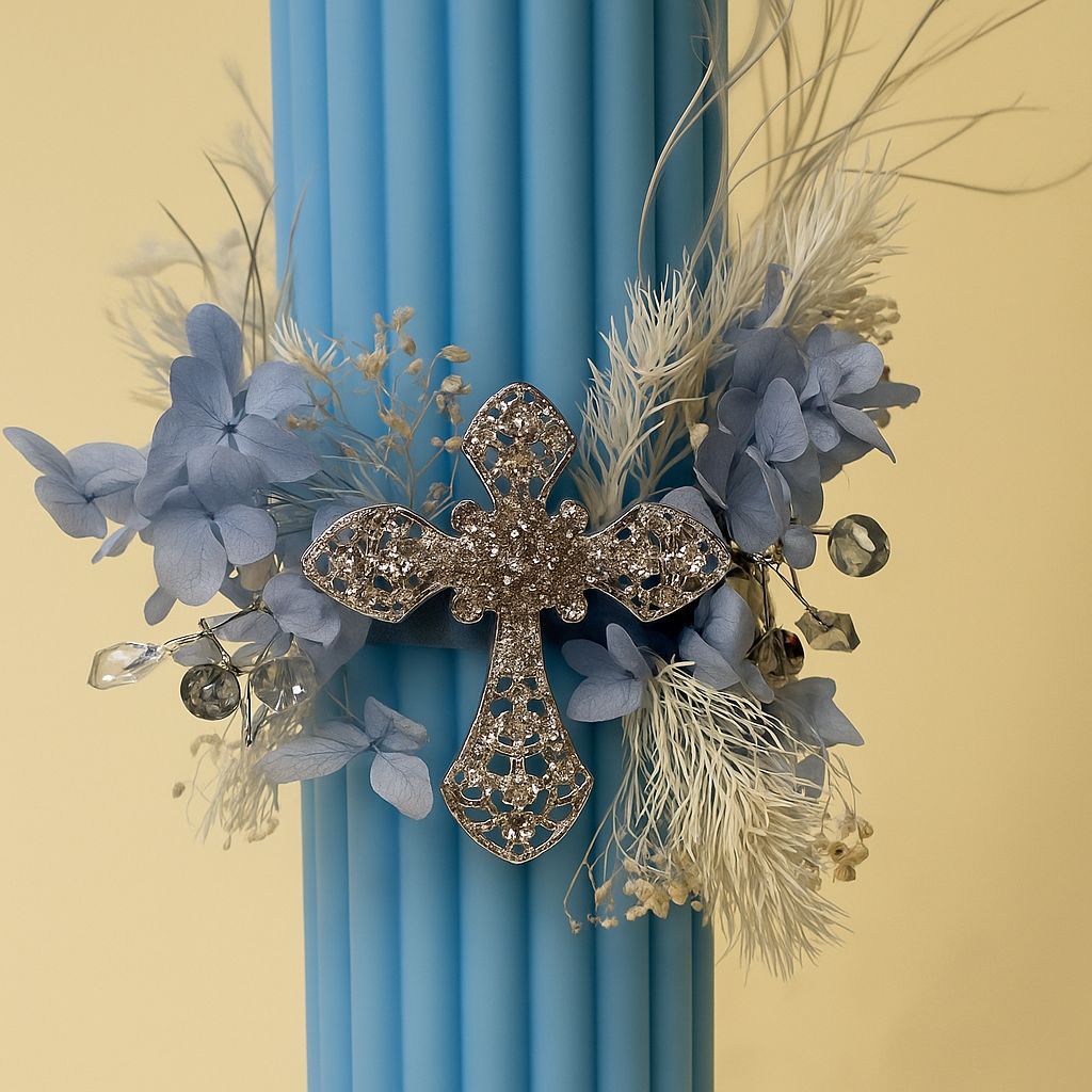 Lumanare de Botez din parafină albastră, cruce argintie decorativă – Model Sky