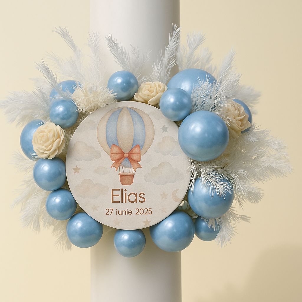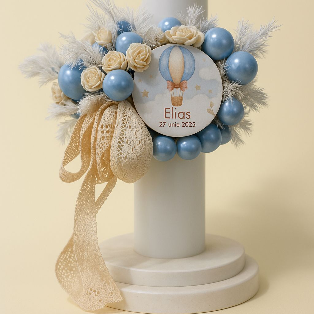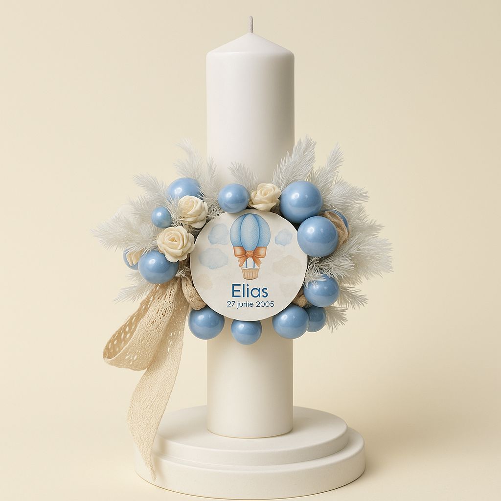 Lumanare de Botez din parafină pentru băiețel, cu detalii albastre – Model Elias