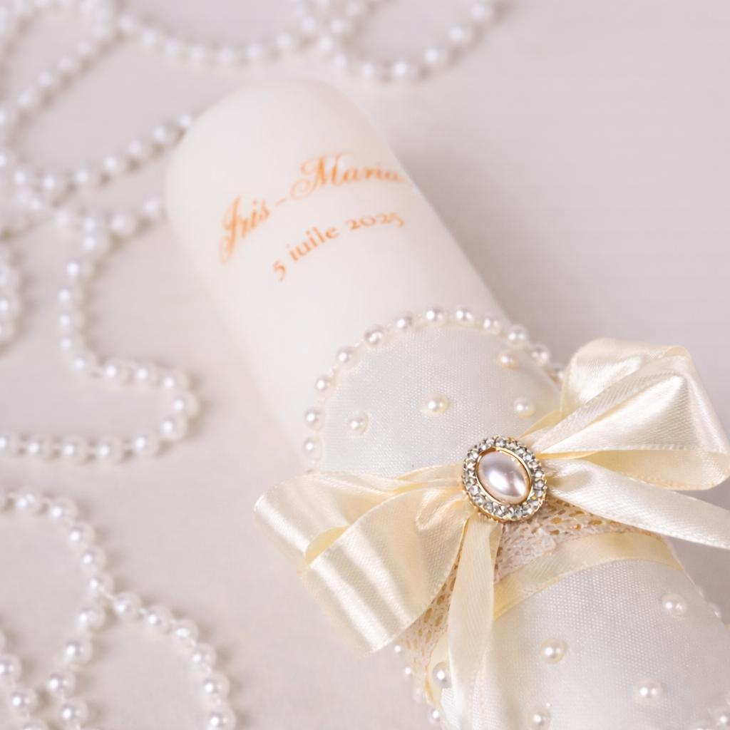 Lumânare de botez elegantă cu dantelă și perle – Model Anastasia