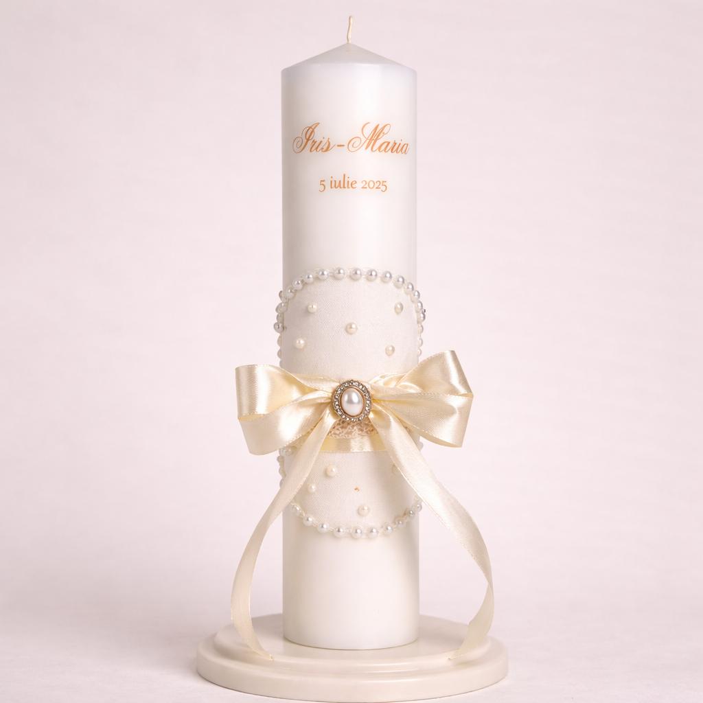 Lumânarea de botez Model Anastasia este o creație clasică și rafinată, realizată pentru ceremonii elegante, în care detaliile fine și simbolurile tradiționale sunt esențiale. Confecționată din parafină de calitate superioară, în nuanță ivory, această lumânare este decorată cu dantelă delicată, șiraguri de perle și o broșă centrală cu aer vintage, oferind un aspect nobil și atemporal.