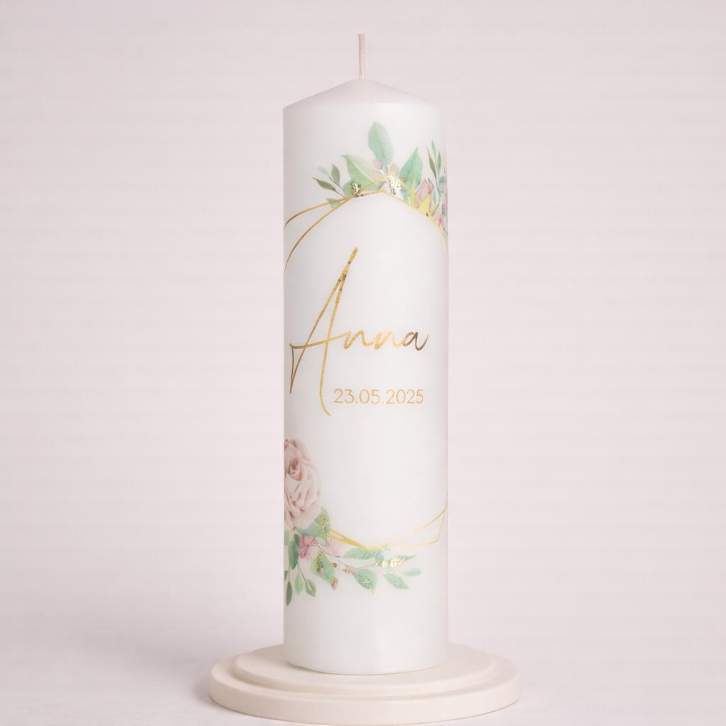 Lumânare de botez pentru fetiță, realizată manual din parafină de calitate superioară, cu un design delicat și echilibrat. Lumânare de botez pentru fetiță, elegantă cu print – Model Anna este creată pentru ceremonii clasice și rafinate, fiind o alegere plină de simbol pentru un început de drum pur și luminos.