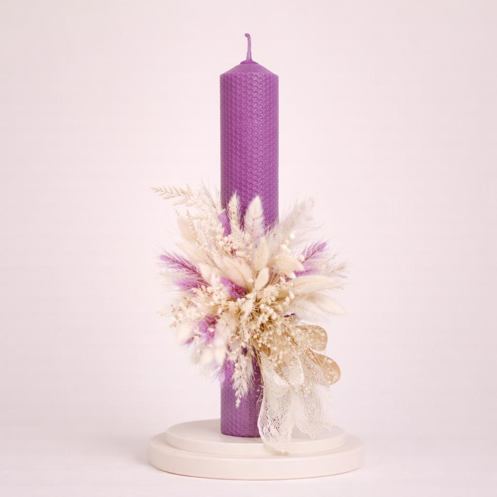 Lumânare de botez cu flori uscate și accente mov delicate – Model Acacia realizată manual cu atenție la detalii. Modelul Acacia îmbină naturalețea materialelor cu eleganța florilor, fiind o alegere rafinată și plină de simbol pentru ceremonia de botez.