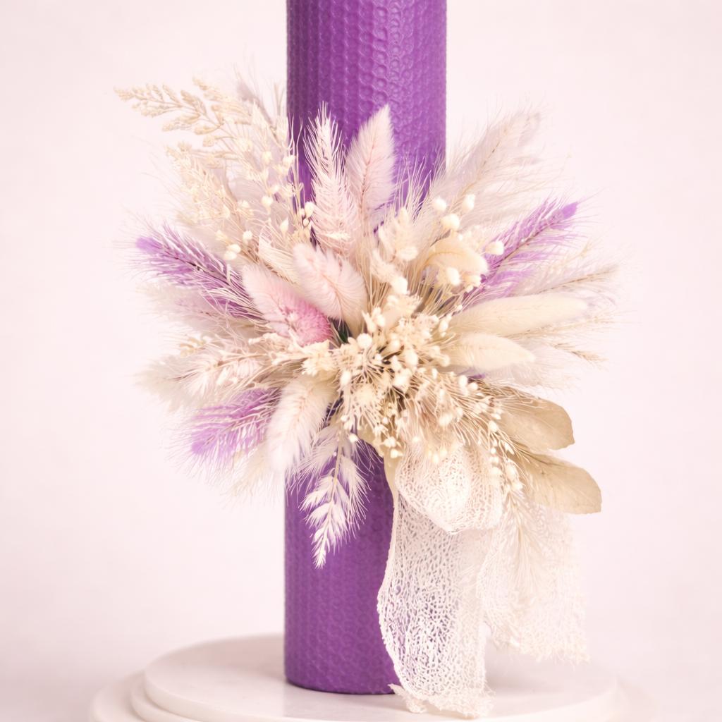 Aranjament floral realizat manual | Lumânare de botez cu flori uscate și accente mov delicate – Model Acacia