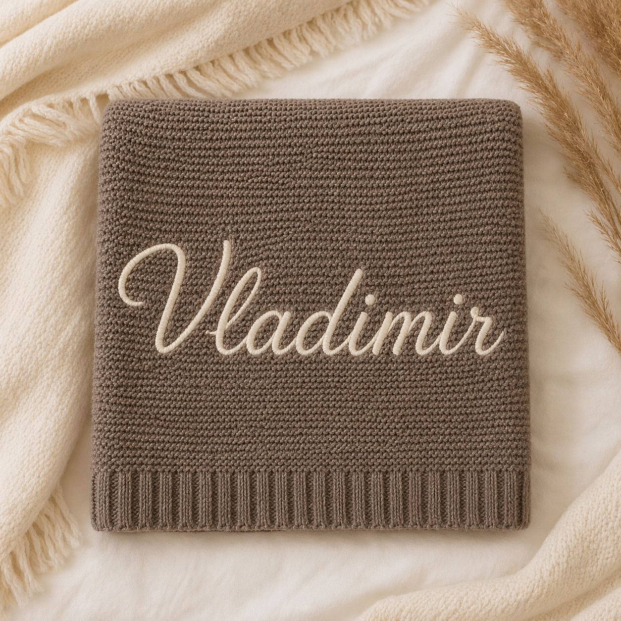 Elementul care face această păturică cu adevărat specială este personalizarea cu nume. Broderia este realizată cu atenție la detalii, într-un font cursiv elegant, care oferă un aspect rafinat și premium. Pentru această variantă, broderia poate fi realizată în nuanțe de crem deschis sau roz delicat, în funcție de preferințe, creând un contrast armonios cu fundalul maro.