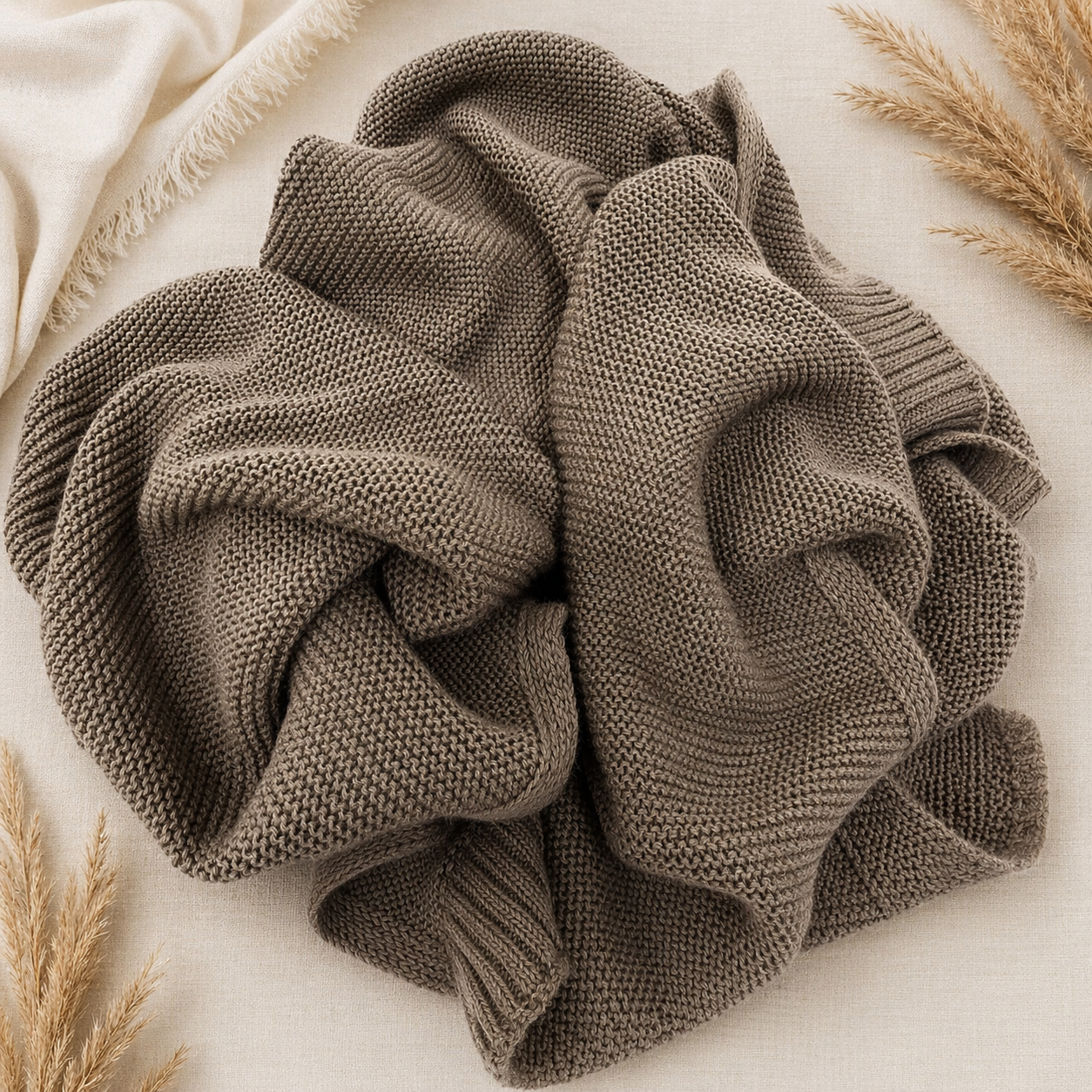 Păturică de botez maro, tricotată, personalizată cu numele copilului prin broderie elegantă. Ideală pentru ceremonie, fotografii și utilizare zilnică. Un produs premium, modern și versatil.