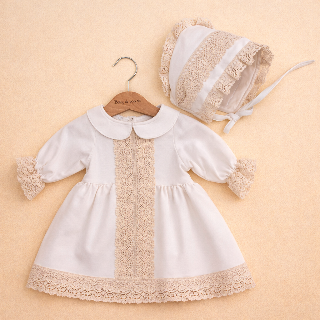 Rochiță botez din bumbac cu dantelă – model Clara, realizată din bumbac 100% natural, cu dantelă din bumbac, căciuliță inclusă și închidere ușoară la spate prin capse. Ideală pentru botez și evenimente speciale.