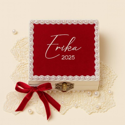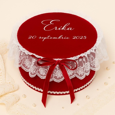 Trusou Botez Fetita Rosu Royal – Cutie rotundă de catifea cu dantelă și broderie personalizată