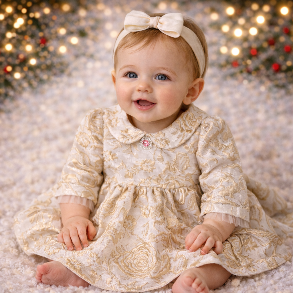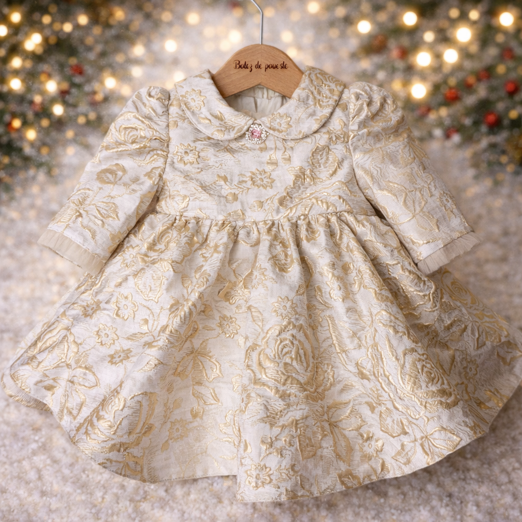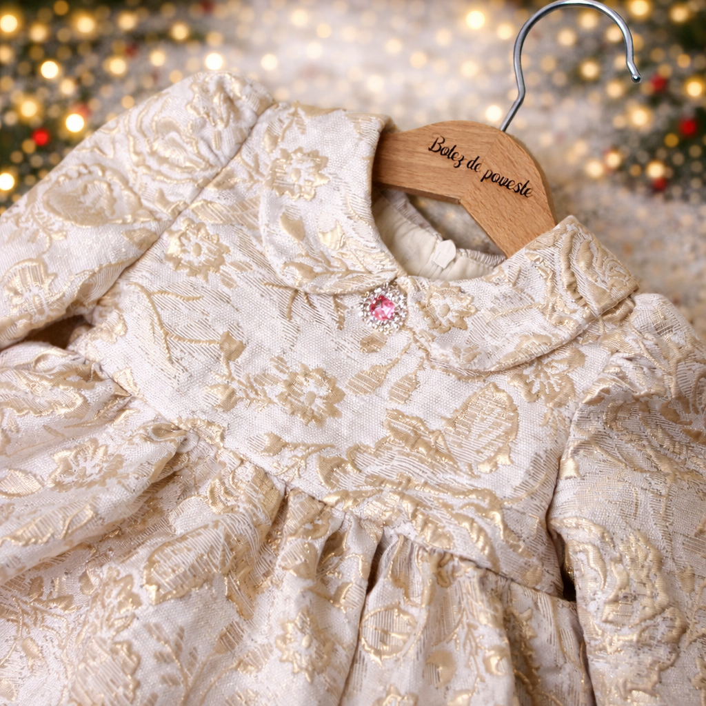 Confecționată din brocard de calitate superioară, cu motive elegante și discrete, rochița impresionează prin textura sa bogată și aspectul sofisticat. Culoarea ivoire, completată de accente aurii fine, adaugă un plus de lumină și noblețe ținutei, fiind ideală pentru evenimente desfășurate în sezonul rece, atât în interior, cât și în decoruri atent alese pentru ședințe foto de iarnă.