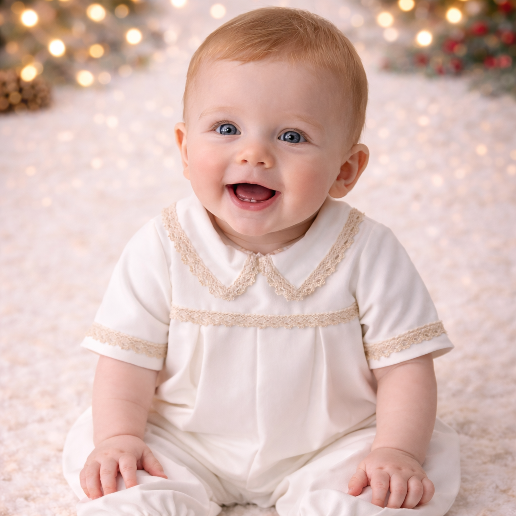Salopetă de botez băiețel Ivory – Model Pure Winter, bumbac satinat este alegerea perfectă pentru un botez delicat și elegant în sezonul rece. Designul său curat, în nuanță ivory, este pus în valoare de detalii discrete din dantelă de bumbac, oferind un aer clasic și rafinat.