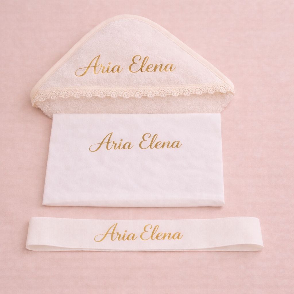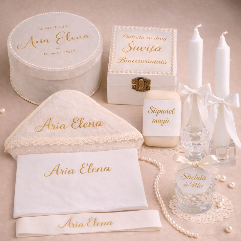 1 x Cutie imprimata personalizata cu numele bebelusului si data evenimentului; ,1 x Fasa personalizata cu numele prin broderie ,1 x Panza de mir cu dantela personalizata cu numele prin broderie ,1 x Prosop bebe cu dantela personalizat cu numele prin broderie ,1 x prosop preot ,1 x Sapun handmade personalizat; |