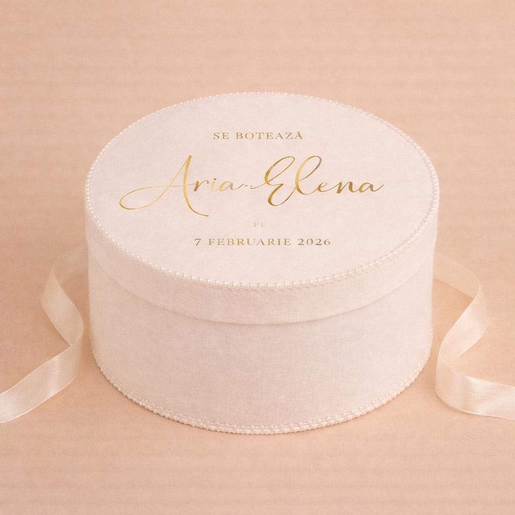 - Cutie din catifea personalizata cu numele bebelusului si data evenimentului;