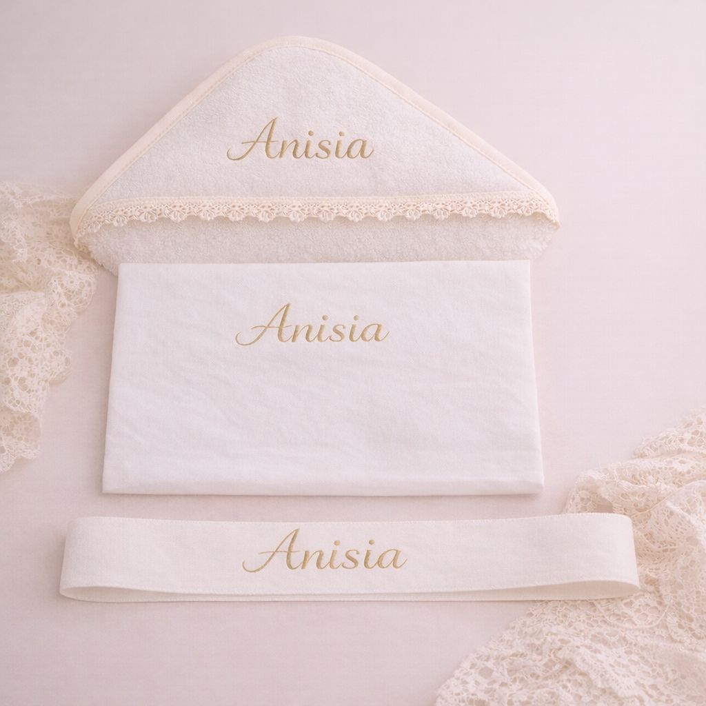 1 x Cutie imprimata personalizata cu numele bebelusului si data evenimentului; ,1 x Fasa personalizata cu numele prin broderie ,1 x Panza de mir cu dantela personalizata cu numele prin broderie ,1 x Prosop bebe cu dantela personalizat cu numele prin broderie ,1 x prosop preot ,1 x Sapun handmade personalizat; |