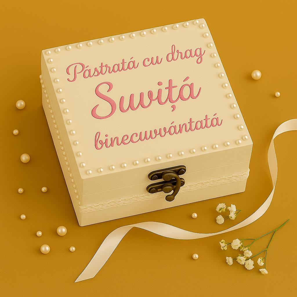 - Cutie handmade, personalizata cu numele bebelusului si data evenimentului;