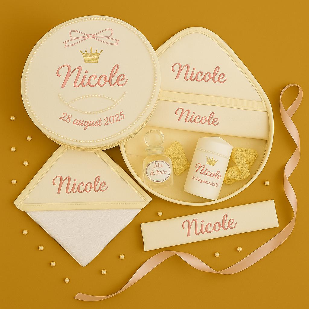 Inspirat din universul prințeselor, acest trusou de botez cu broderie roz și perle decorative îmbină armonios nuanțele ivoire și pastel cu accente aurii subtile, oferind un aspect rafinat, potrivit pentru ceremonii clasice, romantice sau cu tematică luxury. Fiecare element este atent ales și armonizat cromatic, pentru a crea un ansamblu coerent și estetic desăvârșit.