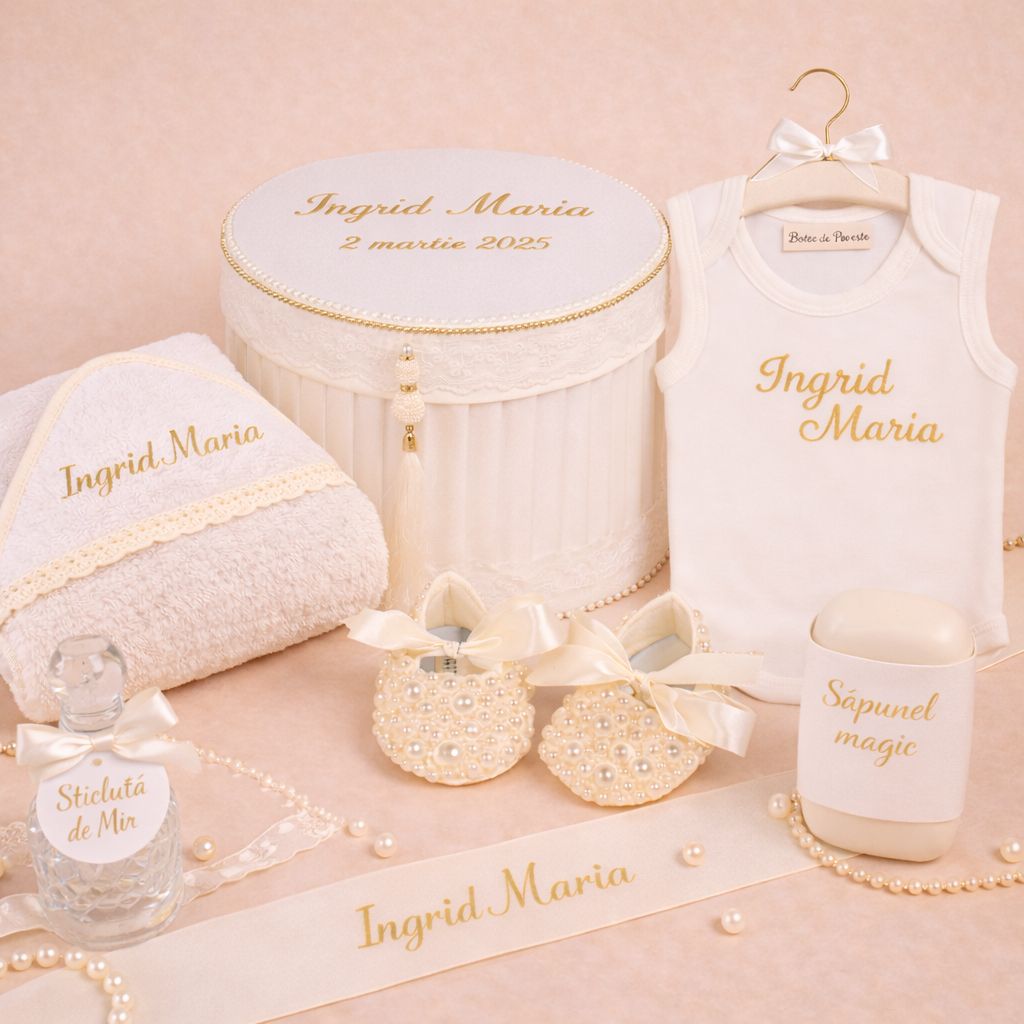 1 x Cutie imprimata personalizata cu numele bebelusului si data evenimentului; ,1 x Fasa personalizata cu numele prin broderie ,1 x Panza de mir cu dantela personalizata cu numele prin broderie ,1 x Prosop bebe cu dantela personalizat cu numele prin broderie ,1 x prosop preot ,1 x Sapun handmade personalizat; |