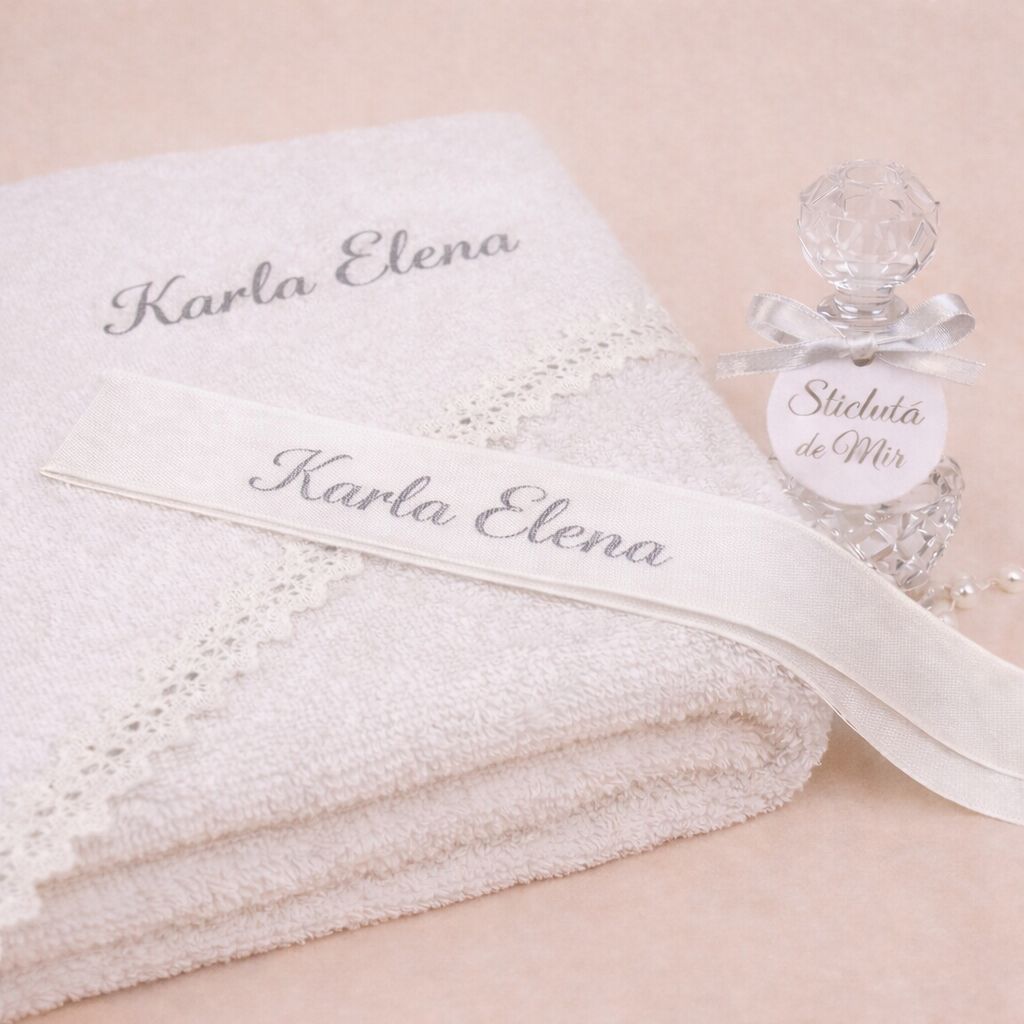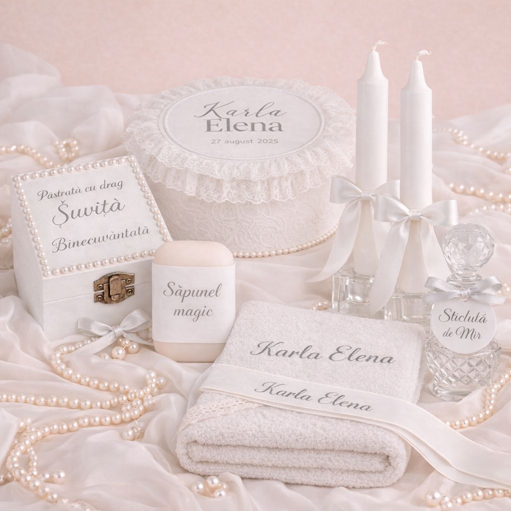 1 x Cutie imprimata personalizata cu numele bebelusului si data evenimentului; ,1 x Fasa personalizata cu numele prin broderie ,1 x Panza de mir cu dantela personalizata cu numele prin broderie ,1 x Prosop bebe cu dantela personalizat cu numele prin broderie ,1 x prosop preot ,1 x Sapun handmade personalizat; |