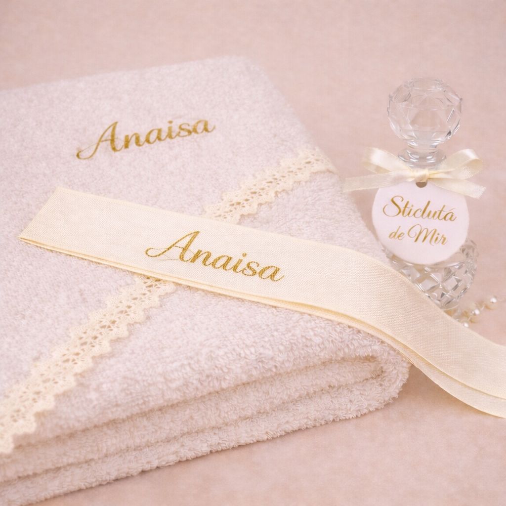 1 x Cutie imprimata personalizata cu numele bebelusului si data evenimentului; ,1 x Fasa personalizata cu numele prin broderie ,1 x Panza de mir cu dantela personalizata cu numele prin broderie ,1 x Prosop bebe cu dantela personalizat cu numele prin broderie ,1 x prosop preot ,1 x Sapun handmade personalizat; |