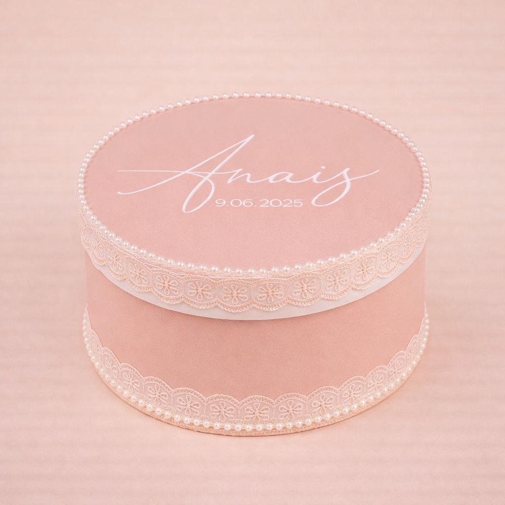 - Cutie lucrata manual, personalizata cu numele bebelusului si data evenimentului;