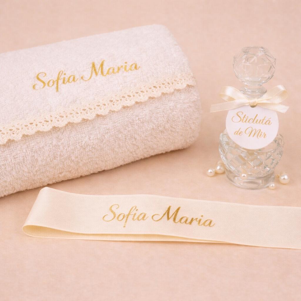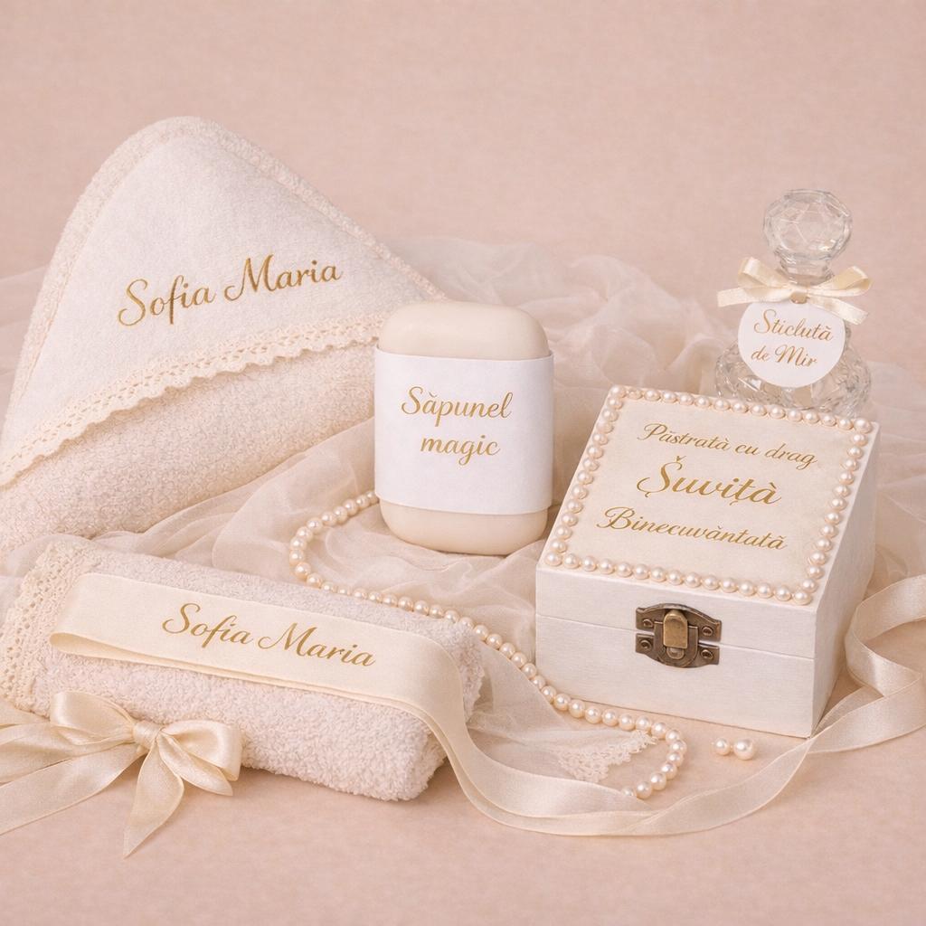 1 x Cutie imprimata personalizata cu numele bebelusului si data evenimentului; ,1 x Fasa personalizata cu numele prin broderie ,1 x Panza de mir cu dantela personalizata cu numele prin broderie ,1 x Prosop bebe cu dantela personalizat cu numele prin broderie ,1 x prosop preot ,1 x Sapun handmade personalizat; |
