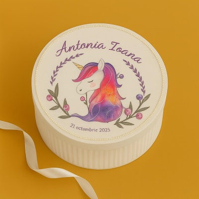 Trusou de botez vesel, cu unicorn multicolor și detalii personalizate – Model Unicorn