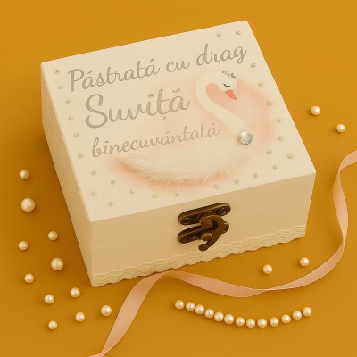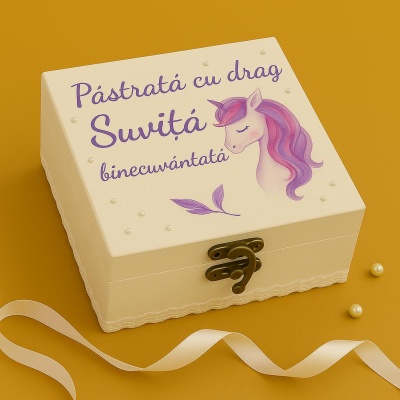 - Cutie lucrata manual personalizata prin gravura laser cu numele si elemente grafice, dar si cu data evenimentului;