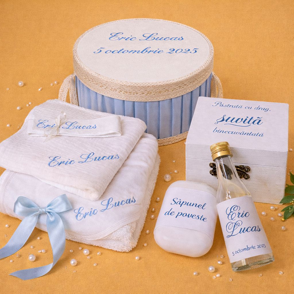 1 x Cutie imprimata personalizata cu numele bebelusului si data evenimentului; ,1 x Fasa personalizata cu numele prin broderie ,1 x Panza de mir cu dantela personalizata cu numele prin broderie ,1 x Prosop bebe cu dantela personalizat cu numele prin broderie ,1 x prosop preot ,1 x Sapun handmade personalizat; |