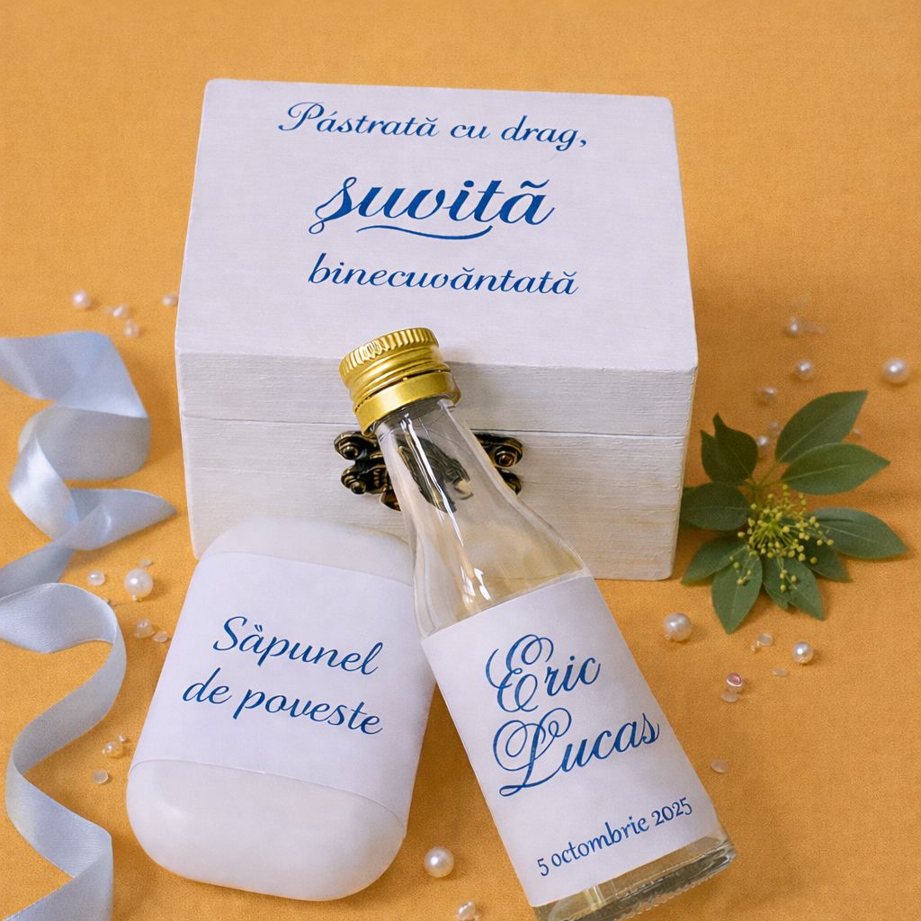 - Cutie handmade personalizată cu numele și data evenimentului,