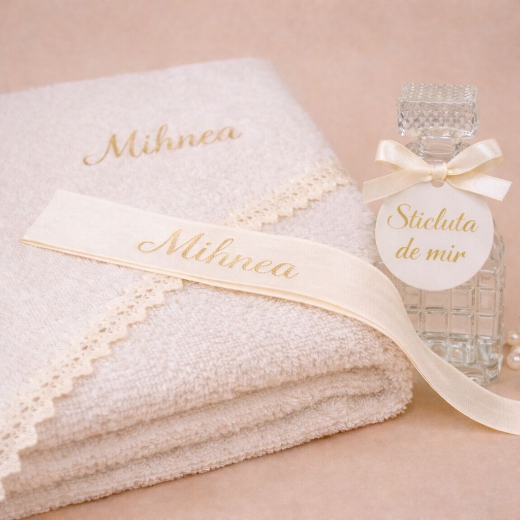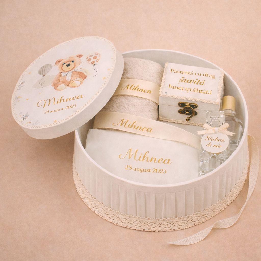 1 x Cutie imprimata personalizata cu numele bebelusului si data evenimentului; ,1 x Fasa personalizata cu numele prin broderie ,1 x Panza de mir cu dantela personalizata cu numele prin broderie ,1 x Prosop bebe cu dantela personalizat cu numele prin broderie ,1 x prosop preot ,1 x Sapun handmade personalizat; |