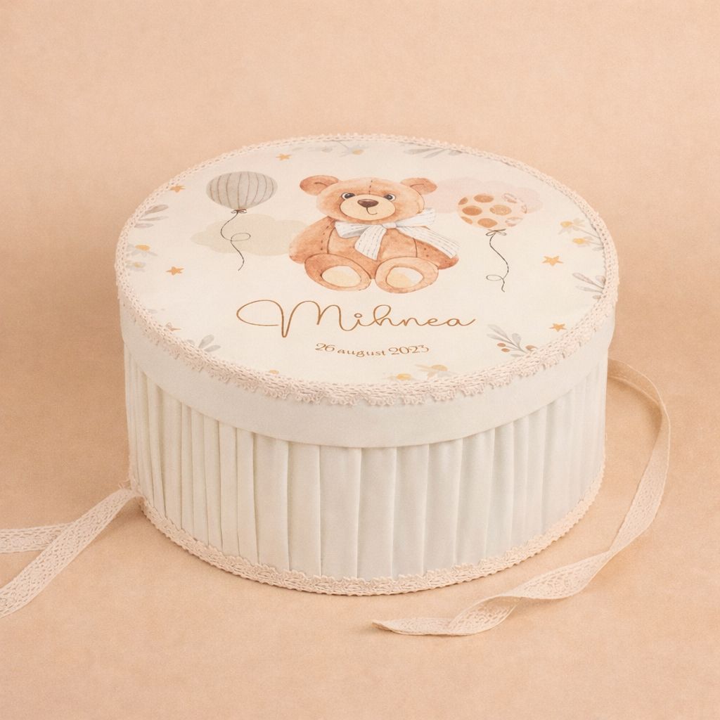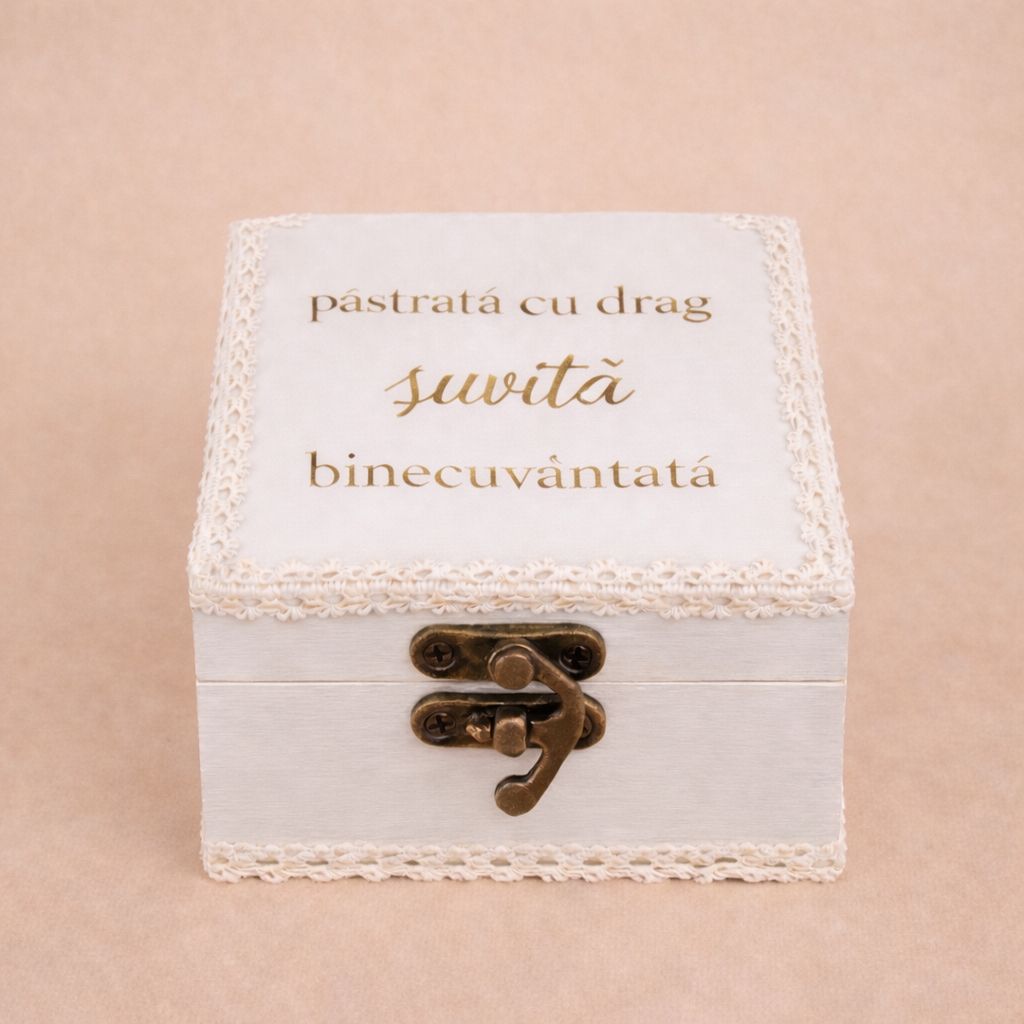 - Cutie handmade personalizata cu numele bebelușului si data evenimentului;